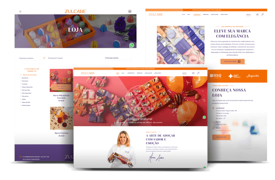 Nova loja virtual da Zulcare, com uma plataforma intuitiva e sofisticada que destaca seus doces especiais. Com um design moderno, a loja oferece uma experiência de navegação fluida, permitindo aos clientes explorar e adquirir os produtos exclusivos com facilidade. Essa solução digital fortaleceu a presença online da Zulcare e ampliou suas vendas.